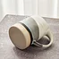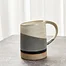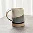 1. Material: This coffee mug is 13.5 oz. It is handcrafted from a warm brown stoneware clay and glazes of different colors to finish, an accented matte glaze, grey glaze and black glaze.